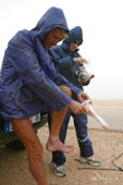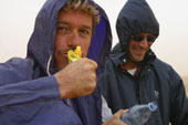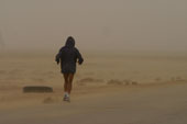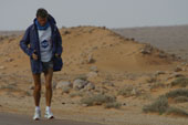 This night, strong rains fell.We are pessimistic for the day concerning the weather conditions.The wind rises and soon a sandstorm plugs us.The visibility is reduced to 200 meters. Serge pushed by the favorable wind and he does not turn any attention to sand and the showers.Serge has today a strange objective : to run 90 km in order to do a kilometric total of 6666 km.Serge is in love with the figures ! 90 kilometers is the record of the distance for Serge on this Trans-Africa race.