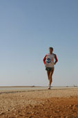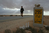 ‘Since Ajdabia, we follow a succession of straight line.We do not cross any village, it has there only the desert which surrounds us. The wind doen’t leave us rest.It blows permanently and the life on the campment is morose.Serge is particularly tired : 10h09 ‘ for 83 km whereas Saturday he needed 10h01 ‘ for 90 km.Serge contrary with usually to decrease his rate on the second part of race. The wind was unfavourable today.Serge has the painful knees, the muscles of the neck, the arms and of the back under permanent tensionare ached.Every evening, he goes to sleep in wondering how it will be able to set off again the following day morning.’
