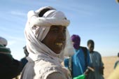 Catastrophe ! Serge mettra 5 minutes pour arriver à la table du petit-déjeuner distante de 150 mètres de la tente : « je ne sais pas si je vais pouvoir partir » . A défaut de prendre ses jambes à son cou, Laure prend le pied de Serge entre ses mains et tout en mobilisant doucement les téguments fait des petites prières. Ce rituel va durer 30 minutes. Levé à 5H30′, Serge décollera contre toute attente à 6H55′. Le rationnel dans ce cas là me dépasse car parti en marchant avec une jambe raide, il terminera son étape à petites foulées. Les miracles doivent exister dans le désert…On aperçoit au loin une caravane : une poignee de touaregs mènent un troupeau de 230 dromadaires (estimation Serge Girard). De Bilma à Agadez, chaque bête aura transporté 7 paquets de 40 kg de sel. Au retour ils rapporteront du mil.Quelques bribes de nuages, flottent en apesenteur au dessus de nous, comme pour nous accompagner jusqu’aux premières dunes. C’est l’occasion pour Ludo, Jean-Claude et Alexis de faire de gracieuses roulades dans le sable en attendant le passage de Serge. Nous n’aurons désormais plus la chance de trouver d’abri ombragé pour installer le camp. Peu d’importance pour la sieste, désormais remplacée par la recherche silencieuse et tête baissée de pierres taillées. La pêche est bonne pour Agali et Mohamed qui nous rapportent de magnifiques pointes de flèches.Les membres de l’équipe profitent de ce troisième jour de désert et de totale autonomie pour prendre une douche à 1,5 litres que Jean-Claude notre économe ( en charge de la gestion du stock d’eau et de victuailles) nous a accordé tous les 3 jours. Les garçons en profitent pour se raser. Ludo embaume telle une fleur au printemps et terminera sa toilette en disant : « vivement dans 3 jours ».Ici, pas besoin de capteur pour se rendre compte que le niveau sonore ne doit pas excéder les 0 décibel. Ce silence est envoutant, la nuit voilée ce soir vous enveloppe d’une paix inégalée. Ce no man’s land est incroyablement apaisant.