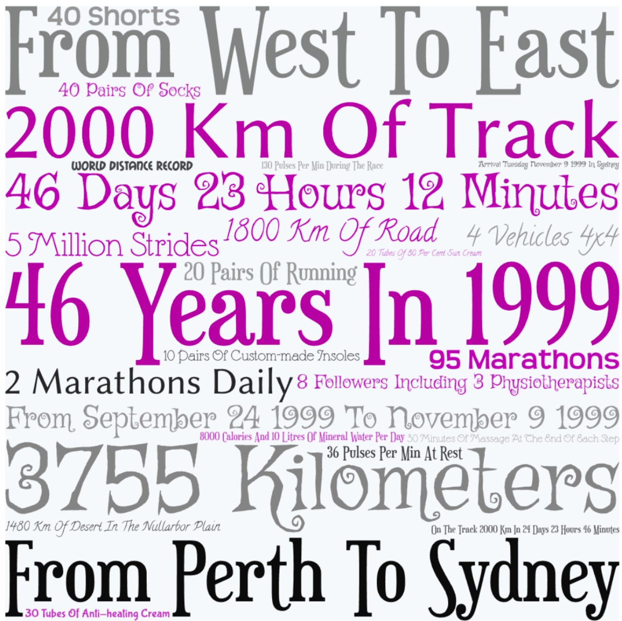> 1999 : Perth/Sydney 3,755km in 46 days, 23 hours, 12′ (world record) Overpowering heat wave.Blanking everything out. Finishing up as quick as possible for today. It is a long way…for who doesn’t follow his dreams. In the desert, beating the world record for the distance is only an excuse. Australia, this wild land that is the size of a continent. September 1999 M T W T F S S 12345 6789101112 13141516171819 20212223242526 27282930 Oct »