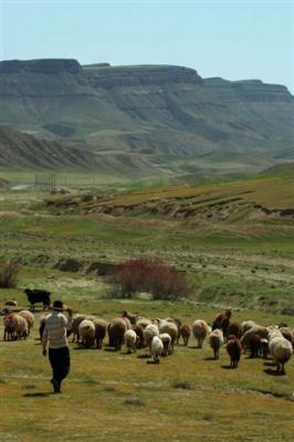 A Heat wave and sumptuous scenery will be remembered as our last day in Iran.  Mozradan is the only village we found on this semi-desert road where we could replenish supplies .  We have passed a few camps of Turkmen nomads who live near their herds of sheep and goats.  Their vast tents are made of white canvas.  The women wear fabrics of many colors, whereas the men usually wear a white turban.  Water seems to be a luxury here and there are many reservoirs to be seen, which would indicate that there are no wells or ground water. In the middle of the afternoon the temperature reached 40° Celsius and the girls wished they could take off their head bands and long sleeves and put on T-shirts. One can always dream!