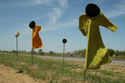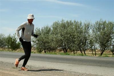 This morning Serge left a bit later than usual.  Every time he goes into a different time zone he has trouble finding his rhythm, especially because his days are long now.  It has been a long time since he spent 11H00 on the road.  For the past three days he has been struggling against a slight head wind and the recurrence of pain caused by a problem with the crural nerve.  It has forced him to walk the last 25 kilometers.  Serge, who could have stopped in the center of the town of Mary, where we will be at a hotel tonight, kept on going with one idea in mind; the famous Chinese border that will close it’s doors for ten days from April 29 to May 9.  He has to maintain his average, against all odds, so as not to be blocked in the no man’s land between Kirghistan and China, nor obliged to have stages of only 10 kilometers per day, which would considerably reduce his overall kilometer average per day.  All these things make this race a true sports performance.  Serge and his team are not out there just for a walk or to have a good vacation.  To run more than a marathon and a half each day amounts to meeting a challenge and it’s our challenge in spite of the uncertainty of such a venture.  We have often been asked the question “What could keep Serge from succeeding?”