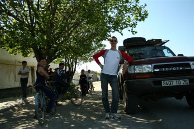 Serge set out at 7H50.  He followed the contour of Bukhara and joined the road to Navoi.  Yesterday we saw a lot of German and French tourists.  April-May and September-October are the best months so the tourist season has just begun.  In the summer the heat is too extreme.  The streets of the ancient city are tree lined and right now the city of Bukhara is nice and green.  Between Bukhara and Qiziltepa there is one village after another and we saw a lot of children on bikes who came to get a closer look at our vehicles.  The roadside is also green but it seems that in the summer all of the vegetation is scorched.  After Qiziltepa the scenery changed radically and we found ourselves in the desert.  In the sand there were only rare tuffs of grass, enhanced by a desolate decor.  It will be this way until Navoi.