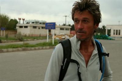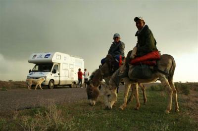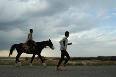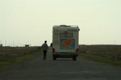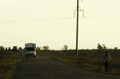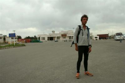 7H05, Serge left and for 10 kilometers was accompanied by Jean-Marc and Benjamin. As we have always done for border crossings, we left Serge with his back pack to reach the Iranian border post, which is located in the city of Serakhs. Something rather unusual, this border post is located at the edge of the road and is only marked by a fence and a sign. It’s difficult to imagine that behind the fence and a few buildings the road continues towards Turkmenistan. The team arrived at 9H00 and for the first time Serge arrived before we could get out of our vehicles. At noon we finally left Iran. We found Serge at the Turkmen border post. He had been waiting for us for an hour in order to have the US$ 10 which everyone has to pay to enter the country. Serge was furious at having wasted the time because he wants to keep up his kilometer average even on border crossing days. Serge set off running on the Turkmen asphalt while we went from office to office to deal with employees who were rather confused by our vehicles’ customs documents. It would take a few more hours before the gate was opened but luckily we didn’t have to go through a search, which would have meant taking everything out of the vehicles. If that had happened we would still be there.