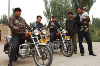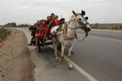 Serge crossed the city of Xinhe at the 25th kilometer and reached the outskirts of Kuqa at the 58th kilometer. These cities stretch over a good 15 kilometers and life there is intense. Everyone has his means of transportation: on foot, on bike, on motor bike, on motorcycle, in donkey or horse drawn cart, by tractor, on a motorcycle dumpster, by taxi, by dump truck, by truck, by minibus, by car, in a beautiful 4-wheel drive…. All these means of transportation share the same roads. Our caravan creates a lot of interest among the inhabitants, who by dozens gather around our vehicles. Number one on the curiosity hit-parade: our trailer. As strange as it may seem, as soon as we leave the city we find ourselves in the desert.