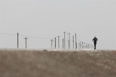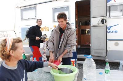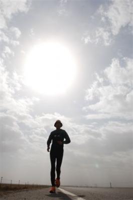 FEET: Serge didn’t use anything special to prepare his feet. He surely has feet which are meant to run because until today he hasn’t had any blisters and the skin of his feet is in perfect condition. The problems come from the toes: he has lost toe nails, has some irritations between the toes because he doesn’t dry his feet carefully after his shower and due to softening caused by perspiration during a day of running, especially now that it’s hot (since Turkmenistan). And there is the whitlow on the 4th toe of his right foot that has been bothering him since Uzbekistan. We can’t decided if it’s a corn, a whitlow caused by a small sliver, or a wart. For the moment the toe is red and has doubled in size compared to the left foot, which indicates inflammation. We have tried to protect the toe with a home made bandage (hypafix) but it hasn’t changed anything. Serge never uses Comfeel. Whenever he needs protection or to bind two toes together we use hypafix (a very fine and micro-porous bandage). Every morning Serge applies Nok cream which prevents overheating and blistering and if he has a bandage he gives special attention that that spot. At the moment, every evening we apply 70% alcohol to disinfect his toes and the nails, with special attention to the area between the toes. It’s worth mentioning that this is the first crossing where Serge has custom made running shoes.
