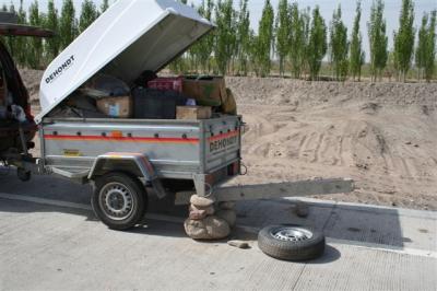 This morning the left tire of the trailer, which was completely deflated yesterday, finally burst. Daniel and Ludo improvised a jack with stones and a cement post in order to change the tire. As for Thomas, having spent his night on the toilet he has been out of sorts all day.