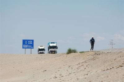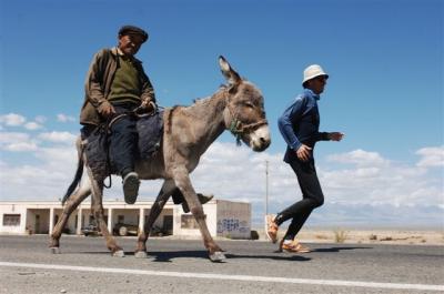 Starting up is difficult, the wind is unfavorable. Yesterday, Serge couldn’t stand eating anything sweet during his feedings and he is now asking for sugar this morning. The days are never the same. However, he does prefer salty food, more Bolinos and more freeze dried noodles (easy to find in China). The machine slowly but surely takes off. Daniel and Thomas are in the 4-wheel drive and give their entire attention to Serge. It didn’t keep Thomas from taking pictures and Daniel from running for 9 kilometers. Serge met a man riding his donkey who accompanied him for a while and both men were all smiles.