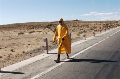 At kilometer 58, Serge was attacked by bees. We thought that the invasion was due to the trees at the edge of the road but no, the trees disappeared but not the bees Serge was going crazy, the more he ran the more he was attacked, stung on the shoulder and the thigh. He broke down and took refuge in the camper. The four vehicles stopped because a solution had to be found. What better than a disguise: Serge was transformed into a bee who had only to blend in with it’s brothers (see photo). We discovered the cause of the problem: trucks filled with beehives were passing in convoy. It’s the seasonal move of the hives and they lost several hundred bees in the process. Really nice those truckers!