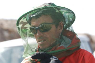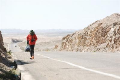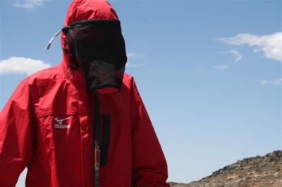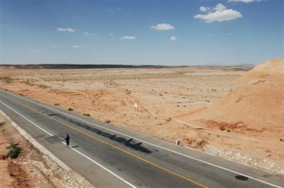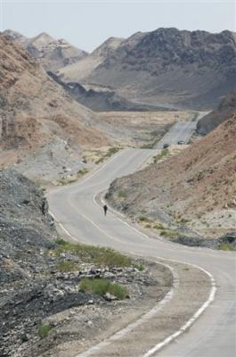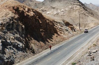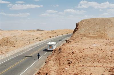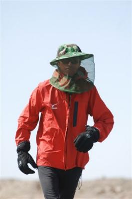 At the 39th kilometer, Serge went over a 1850 meter pass, at the top of which there was a toll (in China, the highways aren’t free so there are lot of toll booths). We went by the service station of Xingxingxia and entered the province of Gangsu. Serge was wearing a mask which Daniel made for him because he was stung by another bee right over the eyebrow and he cracked up. In the afternoon we were able to buy a hat with a veil from one of the quarry workers. So now we are equipped, hoping that the trucks of bee hives will stop spewing the contents of their cargo. When the bees get lost in the desert they go wild and charge to sting. After being with our caravan for three days the CCTV team has left us.