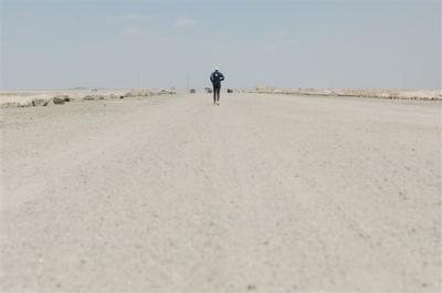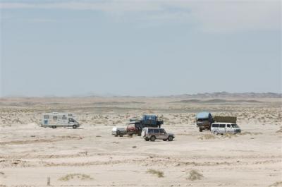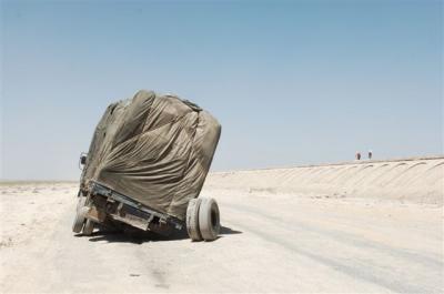 The halo of dust, which is ever present above the track and which extends for kilometers, indicates that the day will be difficult. The temperature has risen to 35° Celsius in the vehicles and we can’t open the windows without risk of being asphyxiated. The windscreen wipers allow us to sweep away the sand in order to have some visibility. Our clothes stick to our skin and with pores that are clogged by sweat and sand we are particularly filthy. Serge, on his toll road, slightly higher than we, somewhat escapes our condition. Feeding has become complicated because sometimes his road moves away from where we are. In the afternoon, a strong wind came up at our back. It isn’t unusual to see Serge disappear in a cloud of dust. These difficult conditions don’t keep the Chinese truck drivers from keeping their foot to the floorboard, in spite of flat tires and cargo that sways madly from left to right. Attention, Danger!