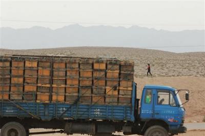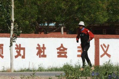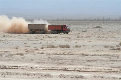At the 40th kilometer, in Yumenzhen, we took up again with route 312 until the end of the stage. Serge ran on his toll road and we on our track. As if this agony weren’t enough, the bee hive truck passed just at that moment, spewing bees, which stuck to our vehicles as if we were nectar filled flowers. Serge put on his veiled hat. At the 73rd kilometer we passed a bee truck which had broken down. There were a few hives that had split open and a veritable halo of excited, black bees made Serge take a detour. What a scourge, what a day! We were all exhausted by the end of it. Serge, as is the case every evening, was extremely tried but he never complains, unless, occasionally, it is to tell us about some pain he has. His tenacity and willpower never fail.