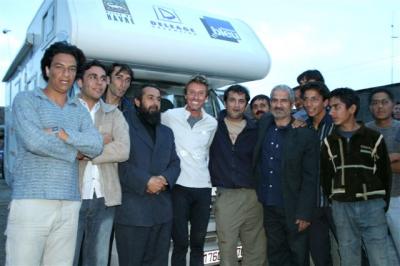 Serge arrive au village même où une cinquantaine de personnes se presse autour du camping-car. Le chef du conseil municipal, vêtu de noir pour cette journée de deuil, est là pour accueillir Serge. Tous applaudissent Serge qui malgré la fatigue arrive toujours à sourire et échanger quelques mots : merci Madgid pour la traduction.