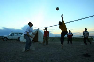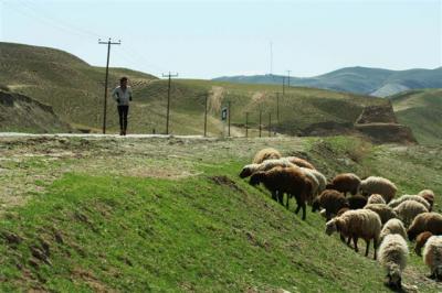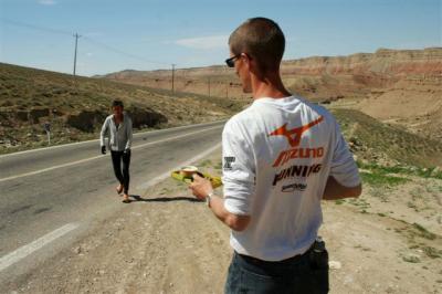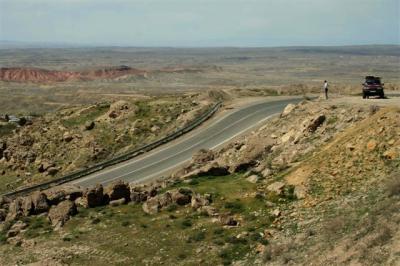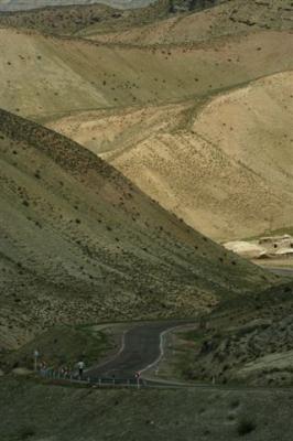 Canicule et somptueux paysages sont à retenir pour notre dernière journée en Iran. Mozradan est le seul village où nous trouvons de quoi nous ravitailler sur cette route semi désertique. Nous croisons quelques campements de nomades turkmènes qui vivent à proximité de leurs troupeaux de moutons et de chèvres, de vastes tentes blanches de toile sont tendues. Les femmes arborent des pièces de tissus colorés tandis que les hommes portent le plus souvent un turban blanc. L’eau ici semble un luxe, les réservoirs sont fréquents ce qui laisse supposer qu’il n’existe aucune source ni nappe phréatique. Au cœur de l’après-midi, le thermomètre atteint les 40°C et les filles rêvent de laissez tomber le bandeau et de se mettre en tee-shirt. Quel doux rêve !
