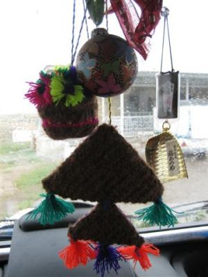 Les traditions demeurent surtout dans les petites villes. Aujourd’hui Bakhtiyar nous a offert un porte-bonheur : un pendentif constitué de 2 triangles en laine de chameaux. Ils sont maintenant pendus aux rétroviseurs de nos véhicules car ils ont pour vertu de chasser le mauvais œil.
