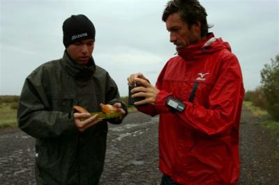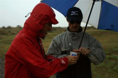 Autant dire que nous sommes saisis et frigorifiés par cette fraîcheur et cette humidité pénétrante. Serge, comme bien souvent dans des moments qui pourraient être des plus déplaisants, prend son mal en patience et finit son étape en blaguant avec Jean-Marc et Benjamin. Lorsque l’on passe près de 10H30’ sous la pluie mieux vaut garder le sourire, même si tout le monde à les pieds trempés et gelés.
