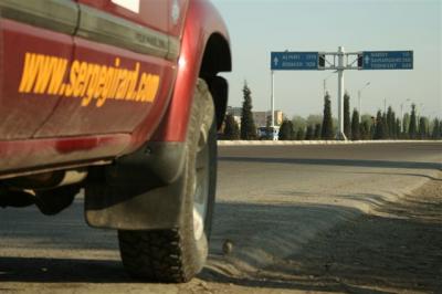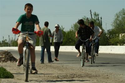 Serge prend le départ à 7H50’. Il suit le contour de Bouchara et rejoint la route de Navoi. Hier, nous avons croisé beaucoup de touristes étrangers, allemands et français. La saison touristique vient de débuter car les mois les plus agréables en Ouzbekistan sont les mois d’avril-mai et septembre-octobre. L’été la chaleur est écrasante. A cette période, Bouchara est une ville verte et les rues de la vieille ville sont arborées. De la sortie de la ville jusqu’à Qiziltepa, les villages se succèdent et nous rencontrons de nombreux enfants à vélo qui viennent regarder d’un peu plus près nos véhicules. Le bord de la route est également très vert, il semblerait que l’été toute cette végétation soit grillée. Passé Qiziltepa, le paysage change radicalement, nous sommes dans le désert : sur le sable quelques rares touffes d’herbe agrémentent ce décor désolé. Il en sera ainsi jusqu’à Navoi.