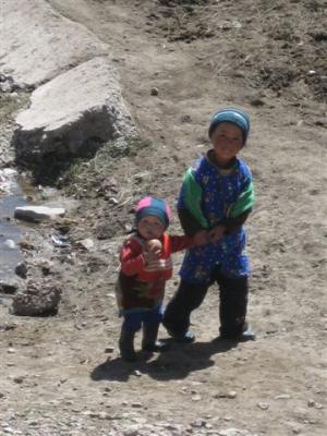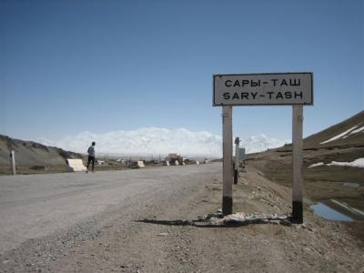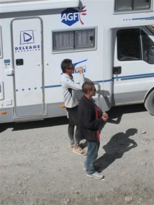 Ouf, nous voici tous en haut du col, nous pensions que le plus difficile était passé et bien non. Après le village de Sary-Tash : la piste se détériore peu à peu pour laisser place à des passages enneigés et à des ornières gigantesques. Il ne faut pas se poser de question : le camping-car doit passer. Nous serrons les fesses tout en faisant une petite prière, ça passe. Après 1 heure de conduite pour faire 12 km, le camping-car devient récalcitrant face à un passage enneigé en côte. Après 3 essais infructieux, il faut se résigner à tracter monsieur une nouvelle fois, merci à ces camionneurs kirghizs pour leur aide. Résultats : 1 heure de passée et 2 paires de pieds trempés.