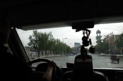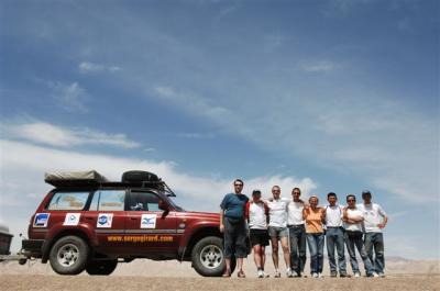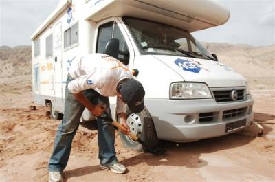Jean-Marc et Benjamin montre un peu l’organisation du 4×4 et des ravitaillements à ses récidivants puisque Daniel était présent de Monéteau à Munich et Ludo a participé à toutes les traversées depuis l’Australie. Le briefing est vite fait. Thomas est photographe et vient avant tout pour vivre l’aventure, c’est lui qui vous régalera de ses photos jusqu’à Lanzhou. François remplace Mathieu à la caméra. Cette nouvelle équipe sera vite mise dans le bain : de grosses guêpes nous auront harcelées toute la journée, 3 piqués : Laure, François et Liu. Puis en milieu d’après-midi, un vent violent se lève, soulevant des masses de sable qui rendent la visibilité difficile. C’est dans cet environnement hostile que Laure plante le camping-car dans le sable. SOS camping-car arrive pour nous sortir de ce mauvais pas en nous tractant. Finalement, nous décidons de rebrousser chemin et de demander l’asile dans une usine de bronze. Nous voilà protégés du sable mais pas du vent, c’est mieux que rien !