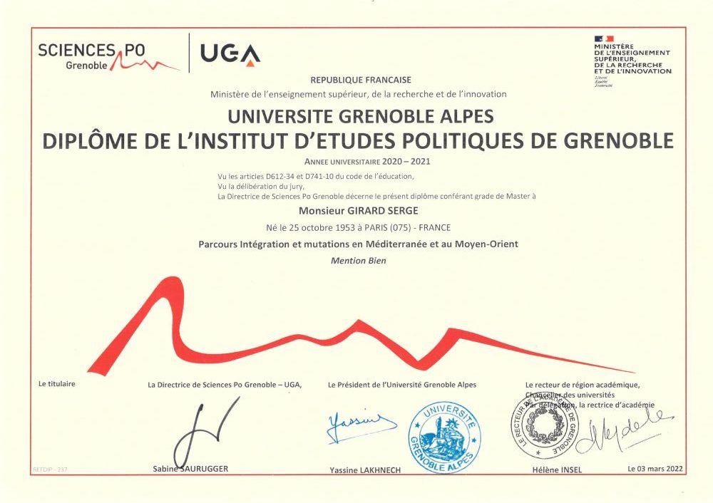 - Graduated from Sciences Po in 2021, at the Grenoble Institute of Political Studies: Master “Integration and changes in the Mediterranean and the Middle East »