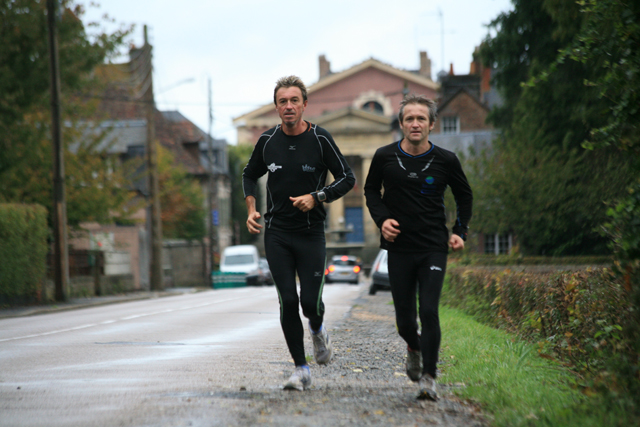 This morning the bus of the Codah (Community of greater Le Havre) was waiting for the runners with croissants and hot coffee. Thomas and Seb, Serge’s younger sons, set their alarm in order to be at the start and accompany him for a few kilometers. In the van Eliane and Jean-Yves (Brigitte’s husband so obviously our friend and neighbor) were ready to start the day, while René and Michel, a special friend (he organizes events the day of the Telethon with his team and last year his town took part in 8 films which were made over a 24 hours stretch by French TV2) go ahead to plot our route. Today we are navigating by sight since we have not made a reconnaissance. Luckily, Christophe and Jacky are watching and guide Serge in this maze of small roads around cities like Montivilliers and Gonfreville l’Orcher which are part of the Codah.