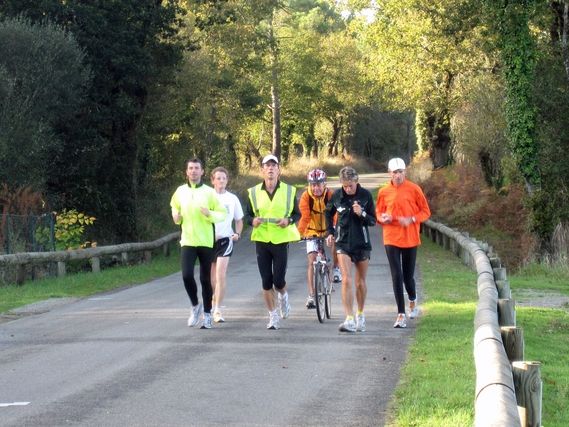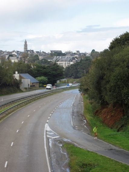 Auray and Vannes, two historic cities will be the pet aversion of the day. It’s easy to imagine how delightful it is for someone who wanders in the center of town. For us who must follow Serge it’s another matter. In Vannes Serge was guided by two local runners and took small streets without telling us. René left Eliane to guide Serge. He lost her, then found her, then took the wrong direction. In the meantime, Serge remained for 10 km without food or warm clothes and had time to get chilled. This evening he isn’t feeling well, with a stomach ache that is keeping him from eating as much as he should.