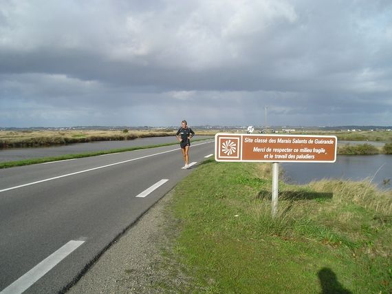 In this very restful and flat country, Serge doesn’t want to lose time with stops because this evening we have a meeting in Pornichet at 5:45 PM and he is ahead of schedule. He decides to extend the stage to clock more than 70 km, instead of the 61 originally planned. Eliane knows the region well and takes Serge to Pouliguen in the salt marshes. Serge has an Excel spreadsheet in his head and saw yesterday that his average daily distance has fallen to less than 70 km. I wonder if his obsession with figures is as strong as his passion for running……