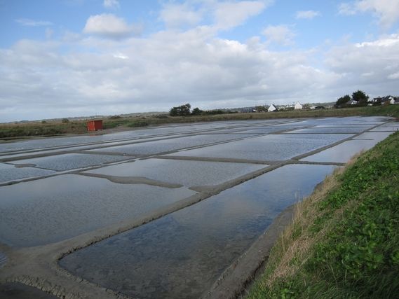 We are in the heart of the salt marshes, a remarkable place which became a World Heritage Site in 1996. The salt is collected by the salt gatherers between June and September, so we are now in the “off” season. The rectangular pools, which look like mirrors, are empty of salt being decanted. For more information you can look at the following sites: www.selguerande.com or www.ot-guerande.fr/marais_salants