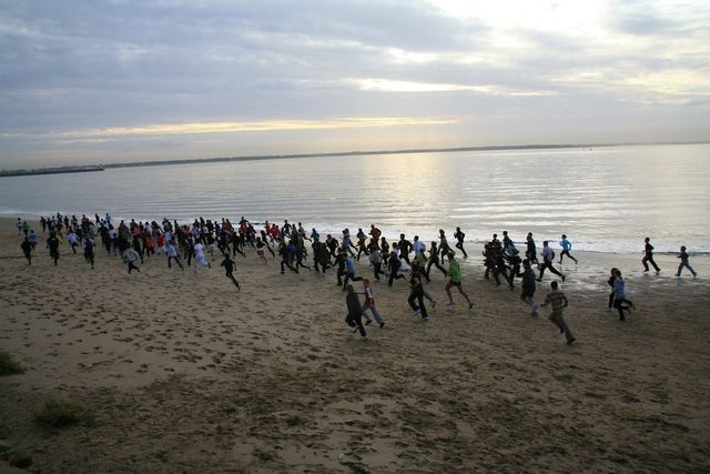 Serge heads in the direction of Sainte-Marguerite, then Saint-Nazaire. Chance is with us because 200 students of the 6th grade are ready to run the schools cross country on the beach. René went ahead and briefed them about Serge and what he has set out to accomplish. So the kids ran with Serge for 600 meters to encourage him and this kind of thing gives you energy for the whole day. There was a fantastic atmosphere and a spontaneous and disconcerting joy for life.