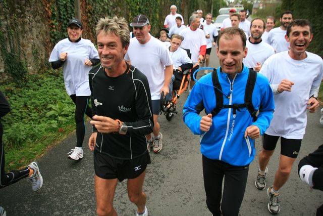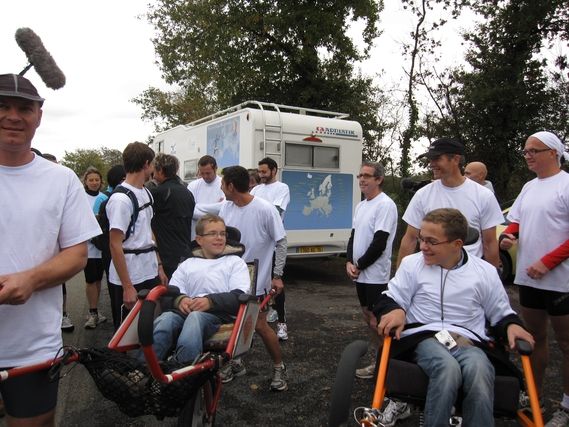 Everyone is ready and the Joëlettes (a special wheelchair invented by a Frenchman for cross country runners, see site http://www.hce.asso.fr/-La-Joelette) of Paul and Guillaume, 13 years old, are waiting to join Serge as he comes by. TV station France 3 is also present. Serge arrives after running 53.5 km, greets everyone and the race takes off again, this time with more people and with a motorcycle escort of national police to ensure safety.