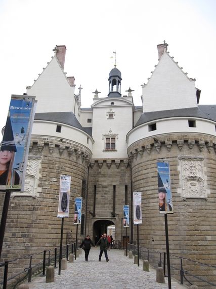 Once in Couëron, the convoy runs along the north bank of the Loire to reach Nantes around 5:45PM. Menacing clouds that hover since morning give way to a heavy sky but we are lucky because the drizzle will not fall until we reach Nantes. As we proceed runners continue to join us, the youngest are waiting for Serge at Place Royale to run the last kilometer to the Castle of the Dukes of Brittany. There are at least 50 children, handicapped youths and the less young who cross the finish line inside the castle, after crossing the draw bridge. Paul and Guillaume cross the finish line walking, assisted by Serge and other children. The stage finishes at night with a send up of balloons from this fairy tale place.