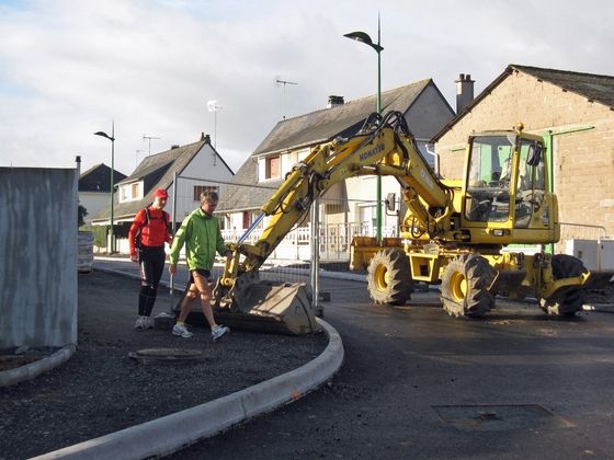 Detours are a daily occurrence and the support team adjusts to the situation when crossing the town of Jaubaudière, which is completely closed because gas mains are being installed. Serge continues his route with François on the D15, while the vehicles take another road to reach Jallais, where we find our two runners
