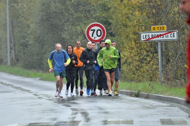 Leaving Rochefort-sur-Loire, the sky darkens and it rains on the runners finishing the stage. Since Denée, there is a small group following the Loire River toward Saint-jean de la Croix before reaching the finish line for the day: les Ponts-de-Cé, to the north of the Loire and south of Angers.