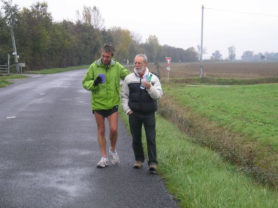 The thermometer doesn’t register more than 8°C and the wind and humidity makes it seem colder but it doesn’t keep Serge from running in shorts. As soon as he is alone he asks for his walkman, for the first time since departure. Listening to disco music Serge lengthens his stride. After Doué la Fontaine there are sparse showers.
