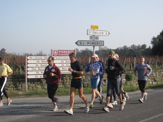 There is beautiful sunshine today and many encounters in the towns we cross. In Saint-Médard d Guizières, the high school is mobilized en masse. A group of students is waiting on the road for Serge with municipal police escort. As they enter the schoolyard all the other students cheer them on. It rejuvenates Serge, who loves a warm atmosphere. It’s the first time since Brittany that Serge is accompanied by runners for an entire stage. Today Jean-Pierre, Frédéric and many others run with him on the roads of Gironde between Saint Emilion and Pomerol. From Dordogne to Gironde, the kilometers speed by under the strides of all these fans of the asphalt.
