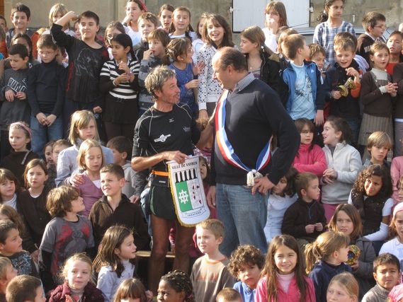 As we leave Libourne, the school of Vayres is waiting for Serge and 215 school boarders are gathered on the stage singing encouragement to Serge. The city’s assistant sports manager, Michel Andrieu, is an ex-world champion rower and won an Olympic medal in rowing in Sydney. Under his arm he holds a scale and he weighs Serge. Is this local custom? Then he presents Serge with the town’s flag and an envelope in which he offers Serge his weight in local wine: Graves de Vayres. What a gift! Overcome with emotion, Serge leaves in the direction of Bordeaux, where he encounters s five classes of students who are lined up along the road at 100 meter intervals singing and waving banners. It’s a magnificent honor guard!