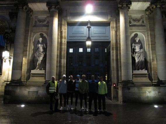 7:30 a few fireflies meet on the Place de l’Hotel de Ville: the 2 motorcyclists, Patrice and Michel, direct operations to get us out of Bordeaux and on the road to Mérignac. Traffic is already heavy.