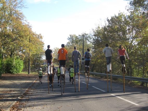 At 1km from the finish is our meeting point at the Montois Stadium of Athletism and Gascony Stilts. Before the mid 19th century, when Napoleon III decided to plant pines on thousands of acres, the Landes was a vast marsh land. In order to watch over their heard, the shepherds wore stilts, which kept their feet dry and enabled them to see their animals. Now they are most often used by folklore groups who dance with them but I have learned via the Internet that Sylvain DORNON from Arcachon went from Paris to Moscow on stilts in 1891 – 2,850 km in 58 days….what a feat!