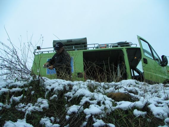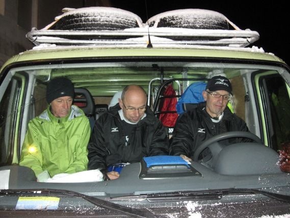 At 6:30 René is busy getting the vehicles cleared of snow.  At 7:00, the 3 boys take off  in the direction of the pass.  They are on the road for 25 minutes before they reach the start.   The snow plows are already at work.