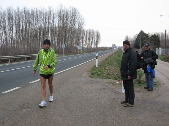 There is a gentle descent to Cistierña at km 52.  The snow has disappeared from the landscape, we are on a plateau at an altitude of 900 meters and there will be one long, straight line after another.  It’s no use looking for inspiration in the scenery at the end of the stage.  Joël and René spend their time betting on what time Serge will arrive for refueling…Joël handles the GPS, René is writing line upon line in his notebook.
