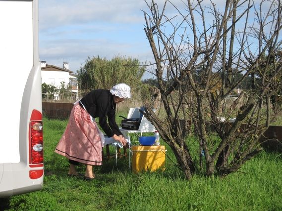 Exiting Aveiro on a dual carriageway takes place in a stream of vehicles. Leaving Ilhavo, there are two detours which force Serge to go an extra 3 km to reach Vagos. Brigitte and Roger accompany the caravan to km20 before leaving to go ahead to km35 to prepare a surprise.
