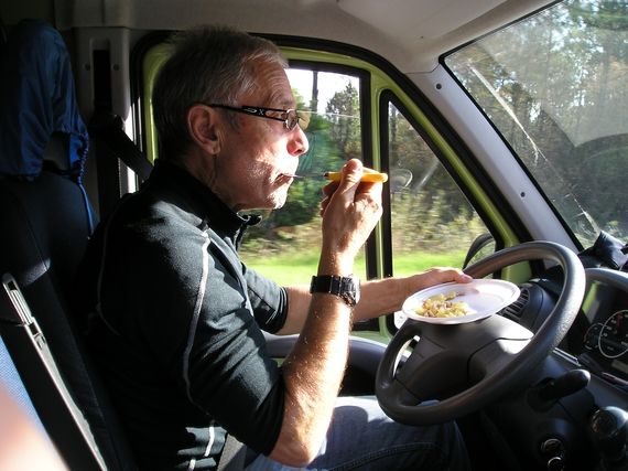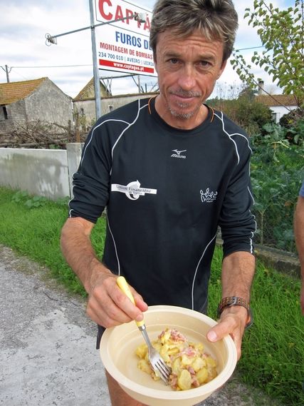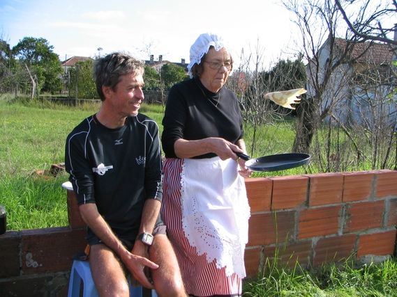At km35 Serge has the pleasure of seeing Brigitte dressed in a Norman costume and making pancakes at the side of the road. Serge doesn’t have to be coaxed to eat 4 pancakes with blackberry jam, before taking off again. The team eats pancakes too and has a “bowl” of homemade apple cider with a steaming portion of “tartiflette” (a deep dish pie of potatoes, onions, bacon and cheese) which is delicious. Brigitte is a wizard!