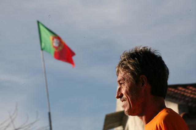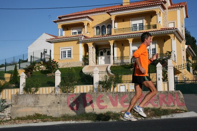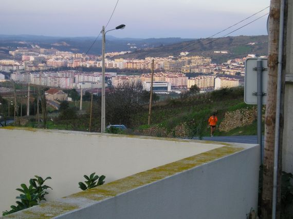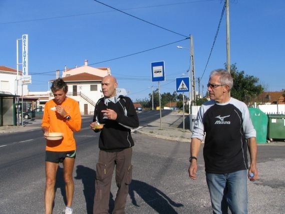 Thrres Vedras, the end of a stage with lots of traffic circles and a superb climb all the way to the village of Serra da Villa, which makes Serge complain, but as long as he grouses everything is OK because grumbling takes energy.