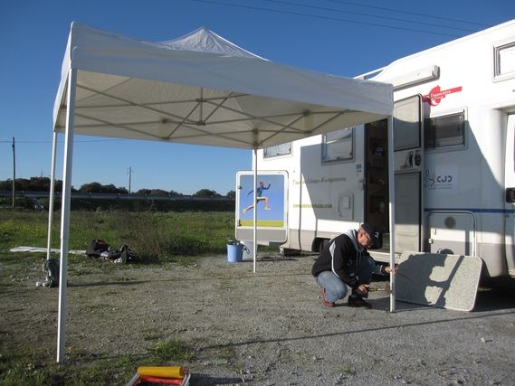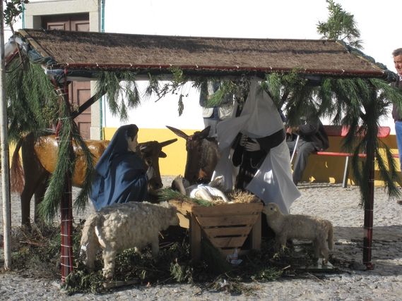 At km 58, we arrive in the town of Montemor-O-Novo which overlooks the ruins of a medieval castle. We turn south on the cork oak lined N2. In this rural environment, wire fences limit properties and from the road a track runs off into the distance. It’s the same principle as in Brazil. This is mainly an agricultural region and rich land owners exploited the workers until 1974, the year of the Carnation Revolution, also known as the 25th of April. The workers of the region, after years of revolt, obtained the right to work without being exploited, in the form of agricultural cooperatives. The land owners were obliged to give up a good part of their land at this time. In the village of Escoural life appears to be very peaceful. Near the Christmas crib there is a bench where it would be pleasant for neighbors to spend the afternoon.