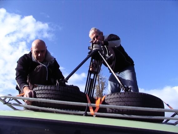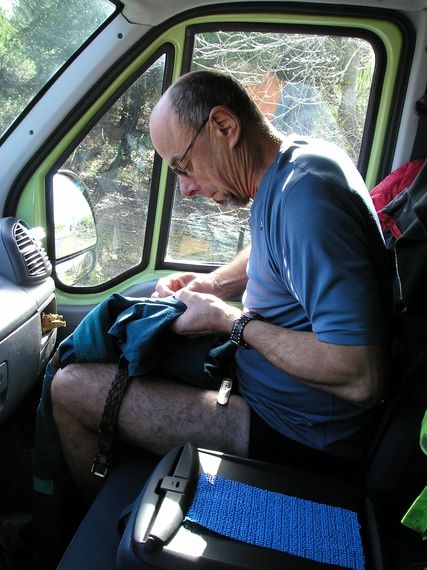 René was called upon twice to get up on the van to hold on to the photographer, Philippe. As for Jojo, it was sewing day; he repaired a tear in his pants. On the Around Europe versatility is necessary.