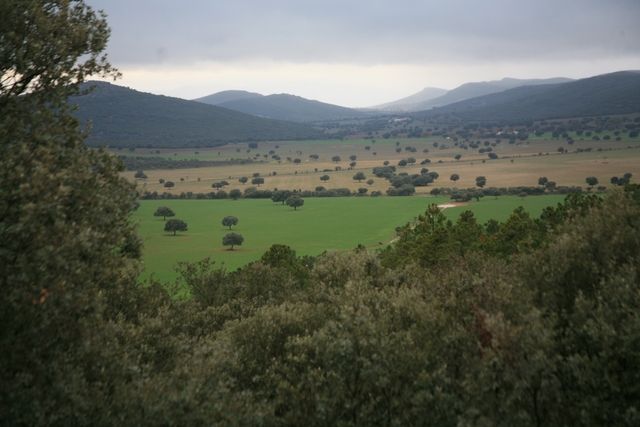 « I started out like a wet turtle (5.7 km per hr at the 10th km). Then I woke up and held to 8 km per hr. until the end. The last two hours my legs hurt because of the cold. I didn’t cover up because when I do I feel hampered. The scenery is magnificent; it reminds me of the film “Out of Africa;” plains with scattered trees. Yesterday, Julio explained to me that the trees have a wide spread of leaves so that a good number of animals can take shelter from the summer heat. I was delighted to see the storks flying and pecking in the stubble of corn. I’m always impressed by their nests. Today my morale is good; I was getting very tired of all the rain. Since leaving Lisbon, we have covered precisely 1,200 kilometers in 16 days and I’m reassured by that.