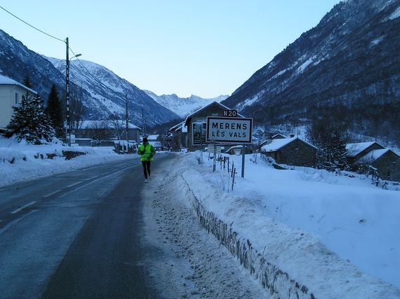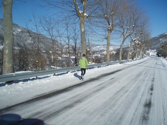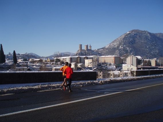 To return to this beautiful and fabulous day, Serge was able to enjoy the magnificent scenery (yes, the going was downhill !!!) and feel excitement. We feel alive again. After Tarascon-sur-Ariège, Patrick, who lives in Foix, the main city of the Ariège Department, joins our runner and is with him until the Bouich Pass (599m), the pace is good and there is lots of conversation. Serge reaches the medieval city of La Bastide de Serou. There is snow everywhere, in spite of the low altitude, and there is no question of taking short cuts because the secondary roads are only partially cleared.