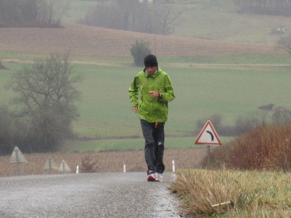 We have a surprise visit at Km 40 from Daniel, who often sends us e-mails. He missed us yesterday in his village, Barbazan-Debat, and would have liked to run a few kilometers with Serge. Today he came to greet Serge from the road side and to bring us a bottle of Champagne, which we will have no trouble keeping chilled. Thanks Daniel.