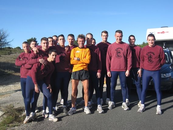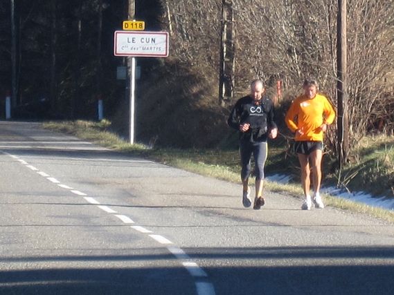 The sky is clear and the Tarn countryside is splendid under a dusting of frost. After Mazamet, the black mountain is crossed at a run with Sébastien, who makes hops with his car and dog, Duna: “a few kilometers in the car, then I come back running, I join Serge, I get my car and on and on…” We leave the Tarn and the Midi-Pyrénées Region and at the town of Les Martys we are in the Aude Department and the Languedoc-Roussillon Region. A few piles of snow are a reminder of what fell last week. Serge is in great shape; he takes some clothes off, he smiles and moves ahead with pleasure. His eating is almost normal……