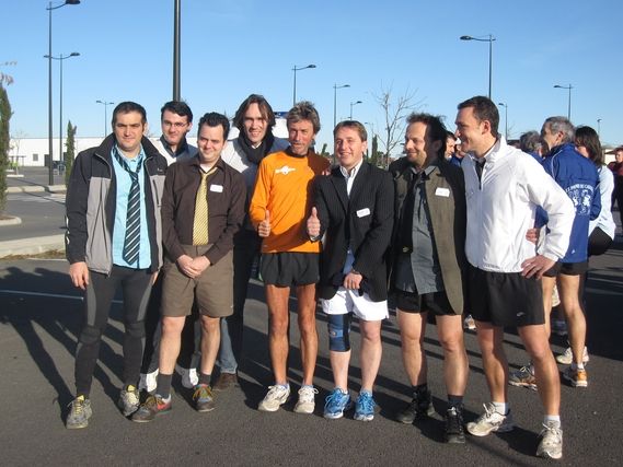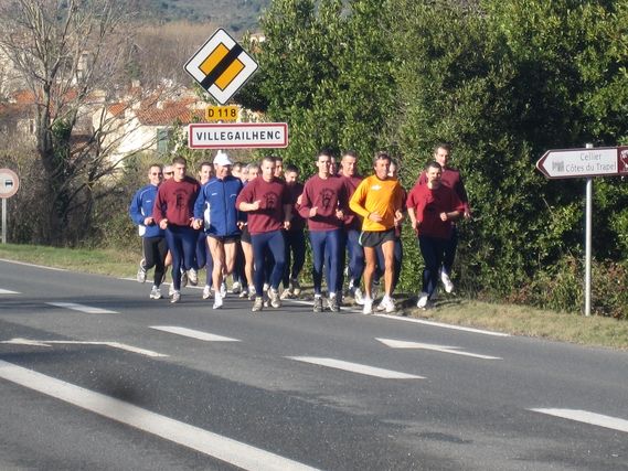 At the foot of the Black Mountain and facing the Pyrenees Mountains, vineyards stretch out in the sun. The Poumpils du Cabardès Club (the calves of Cabardès in the Occitan language) comes to run the last kilometers with Serge and brings a carton of wine from Cabardès, which is near the village of Villegailhenc. Many thanks.